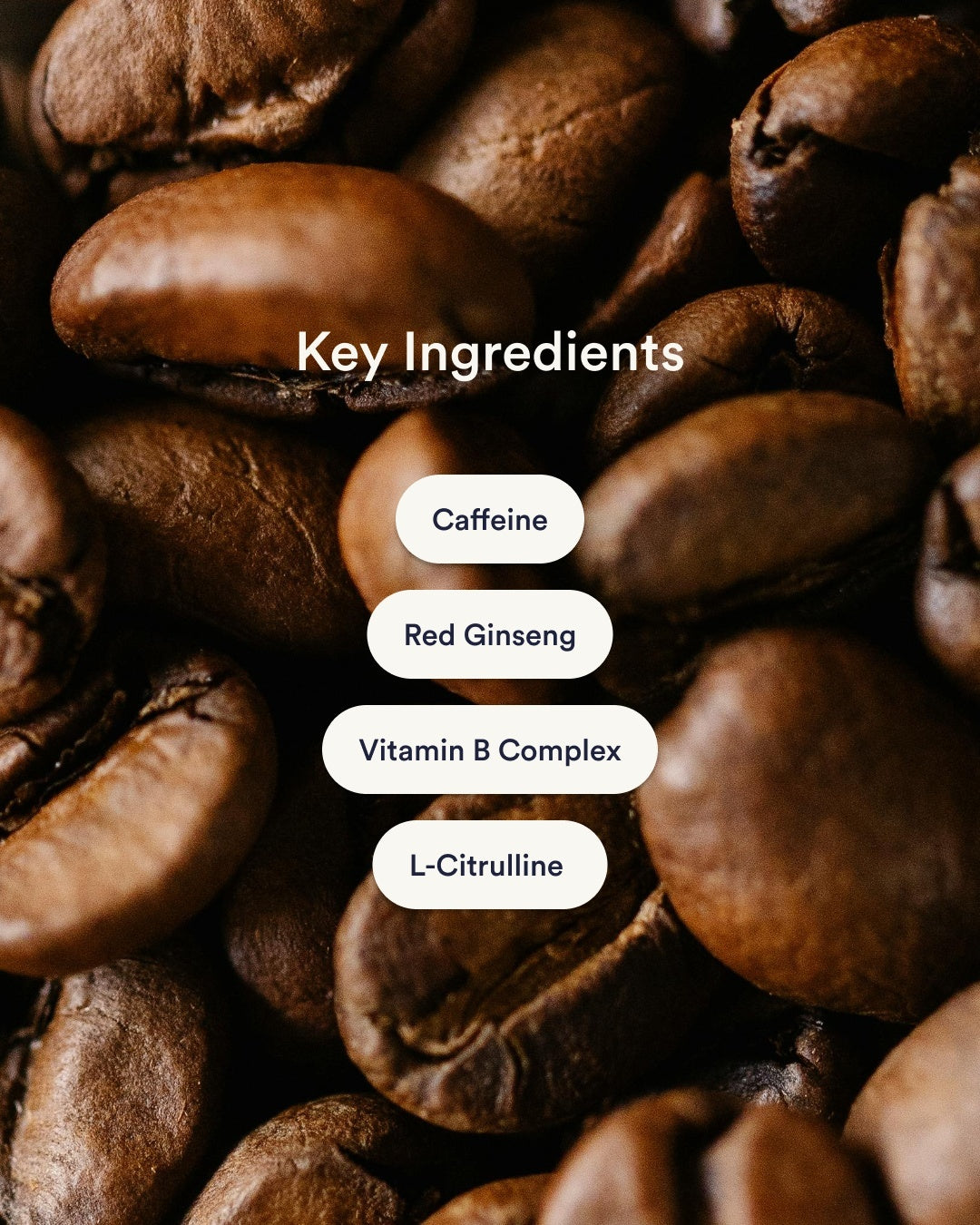 Caffeine 12.5mg, Beta Alanine 5.6mg, L-Citrulline 5.5mg, Red Ginseng 4.5mg, Vitamin B1 (Thiamine Mononitrate) 1.2mg, Vitamin B2 (Riboflavin) 1.3mg, Vitamin B3 (Nicotinamide) 12mg, Vitamin B5 (Calcium D-Pantothenate) 5mg, Vitamin B6 (Pyridoxal 5-Phosphate) 1.7mg, Vitamin B12 (Methylcobalamin) 600mcg, Vitamin B9 (Folate as 5-MTHF L-Methylfolate) 40mcg, Vitamin B7 (Biotin) 30mcg.