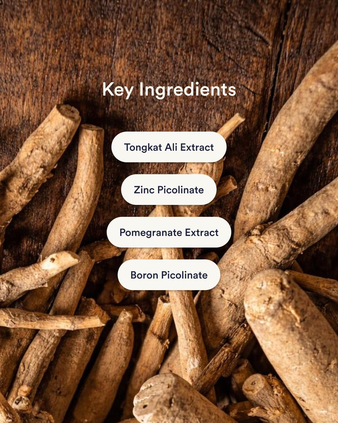 Tongkat Ali Extract 14.5mg, Zinc Picolinate 12mg, Pomegranate Extract 8.5mg, Boron Picolinate 5mg.