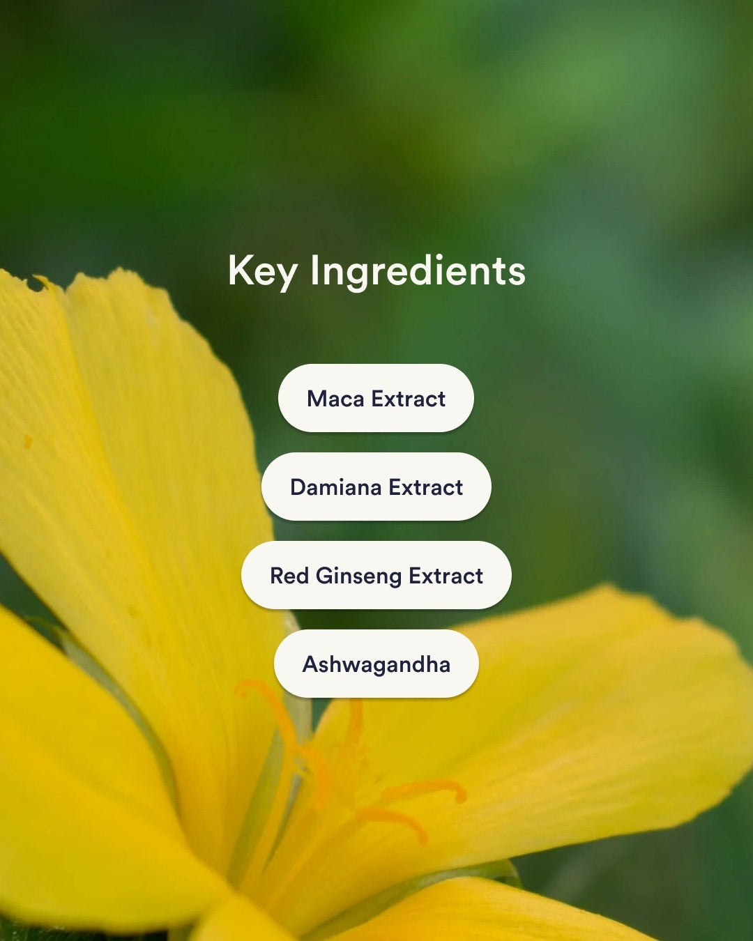 Kind Love Blend (Maca Extract, Damiana Extract, Red Ginseng Extract) 17.8mg, Ashwagandha Extract 7.2mg.